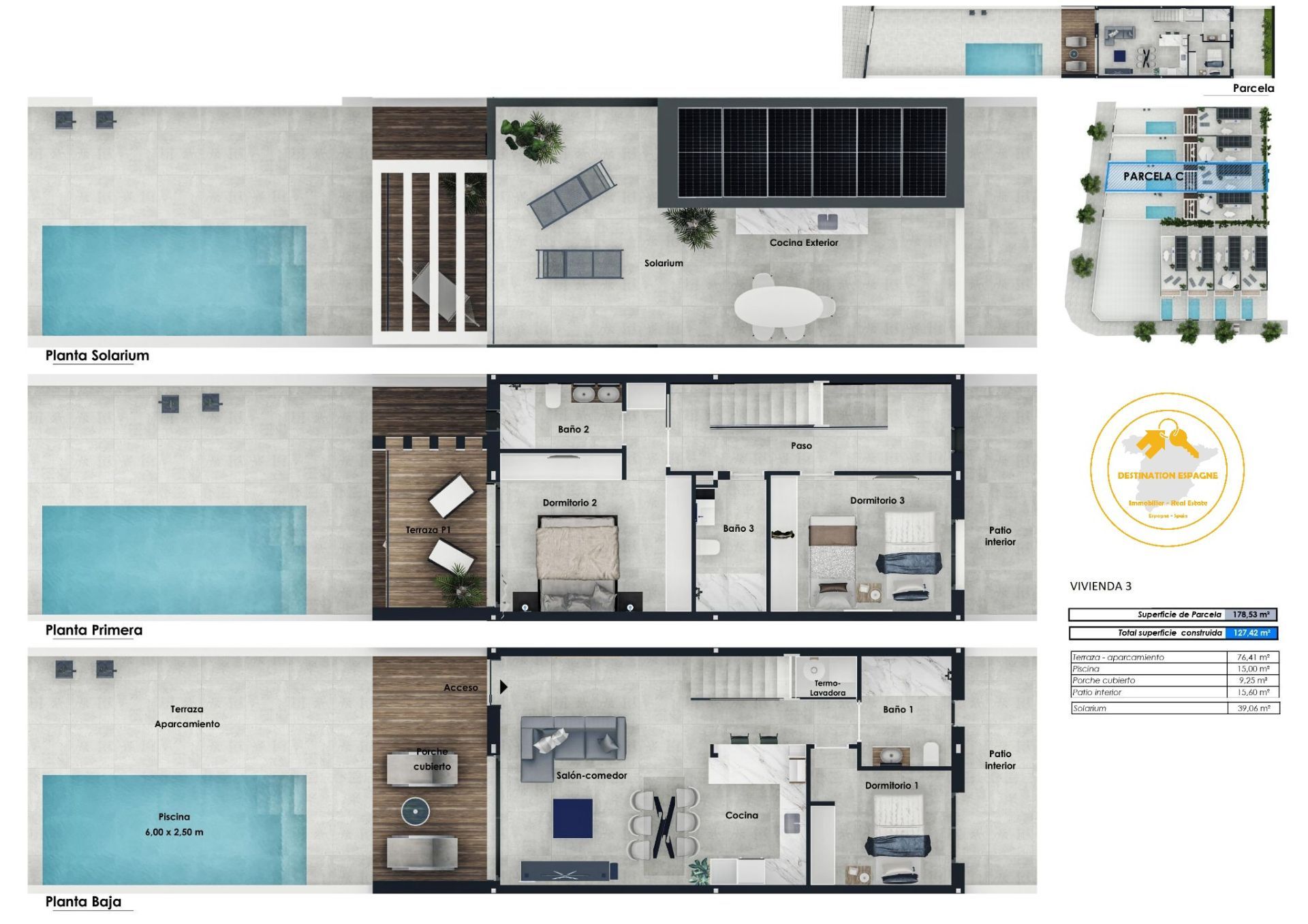 Caractéristiques: 3 chambres, 3 salles de bain, Cuisine ouverte, Salle à manger, Salon ouvert, Patio intérieur de 15,60 m2, Terrasse de 15 m2, Solarium privé de 39,06 m2 ……