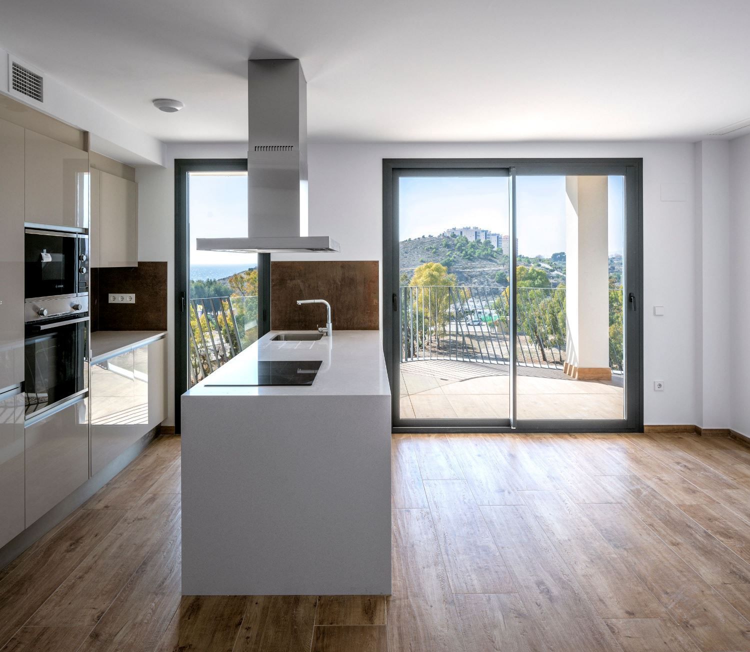 Meubles de cuisine équipés, composés d’éléments bas et d’éléments hauts. Portes en stratifié haute pression avec finition brillante. Portes ouvrantes avec poignée en aluminium intégrée sur les meubles bas et tiroirs auto-freinés.