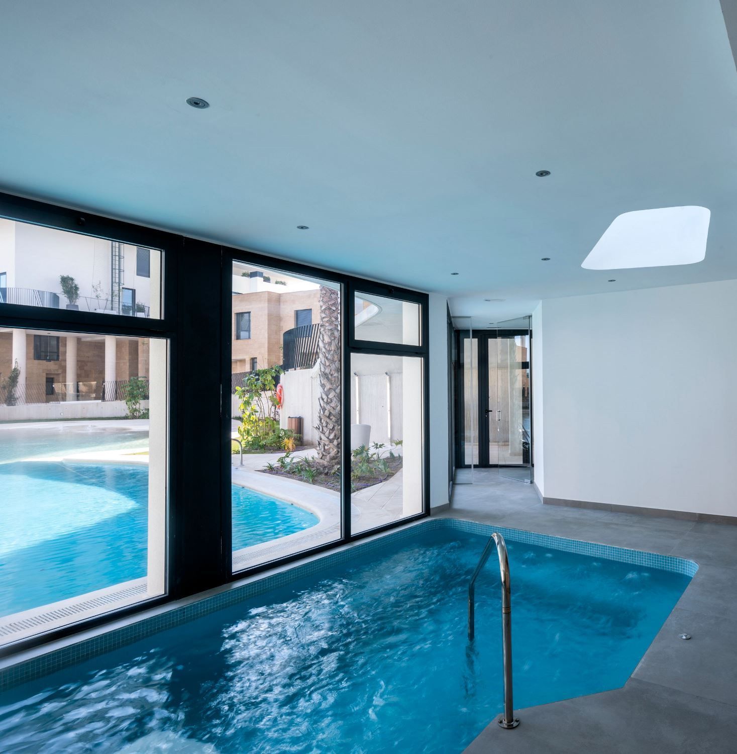 Résidence avec des zones de loisirs et de détente avec éclairage : piscine, spa, jardins, aire de jeux pour enfants, gymnase extérieur, chaises longues et parasols, parking à vélos.