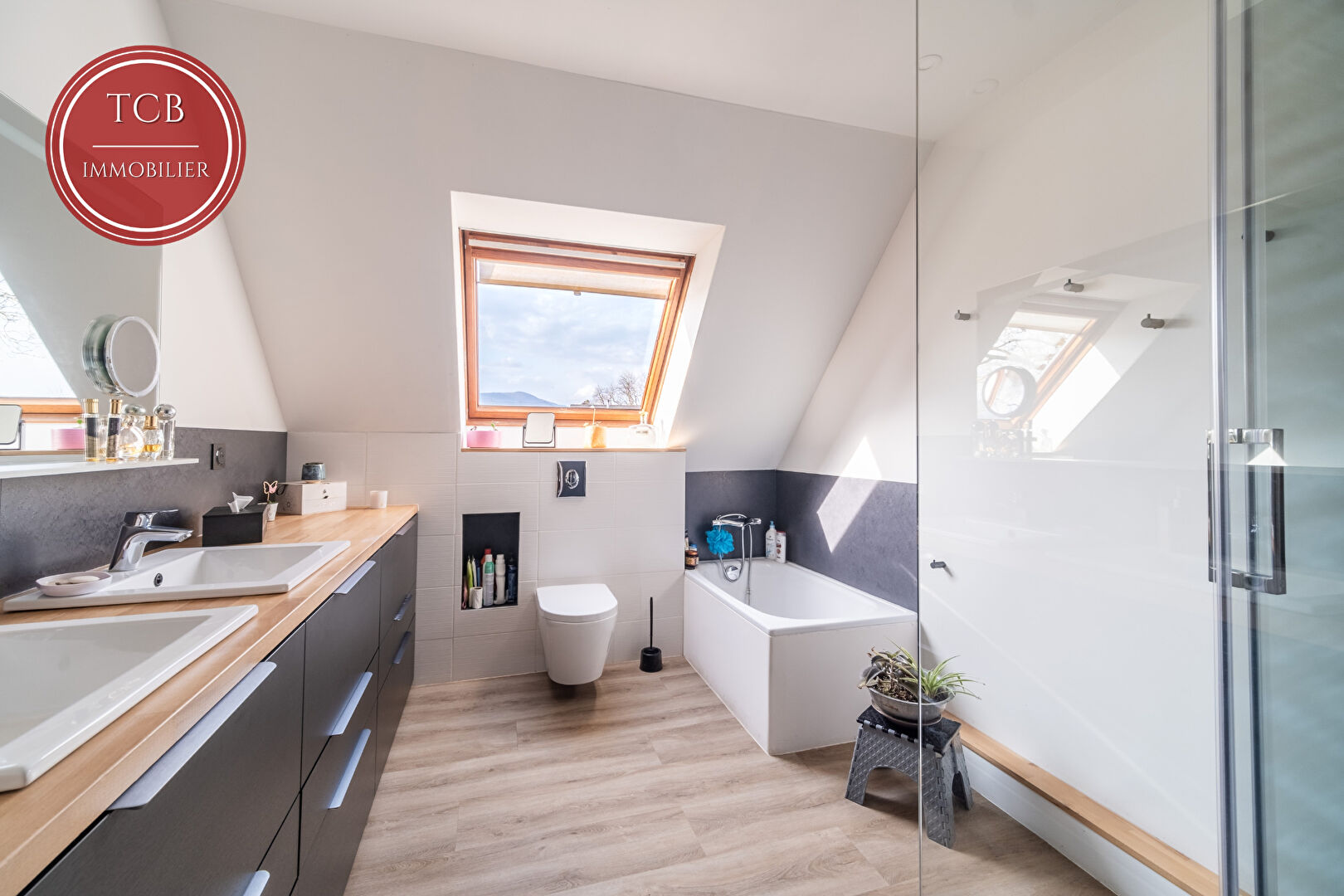 -une salle d’eau moderne de 9 m² avec meuble double vasque, baignoire et douche