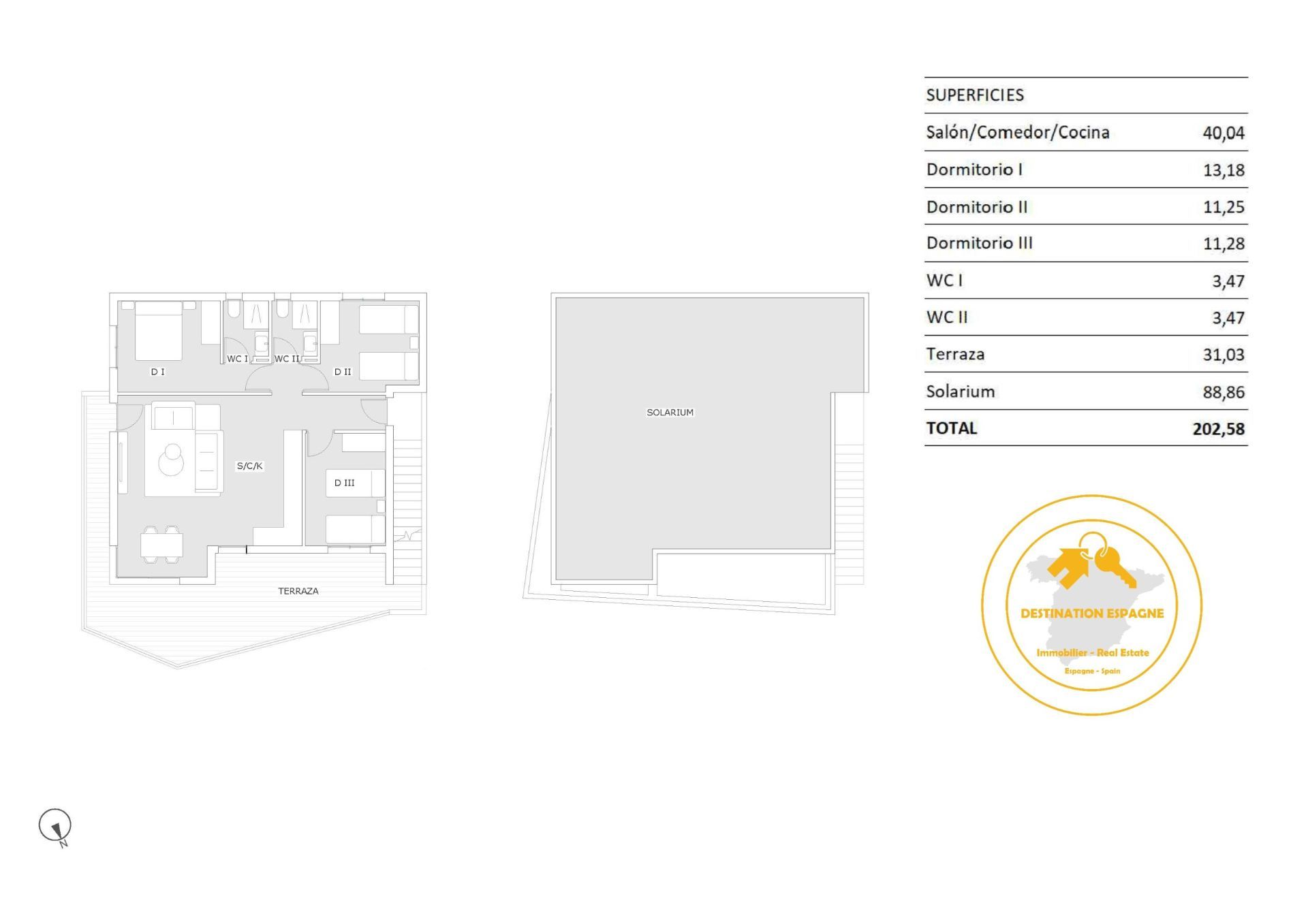 Caractéristiques : 3 chambres, 2 salles de bain, Cuisine ouverte, Salle à manger, Salon ouvert, Terrasses de 31,03 m2 et Solarium Privé de 88,86 m2 …. etc …