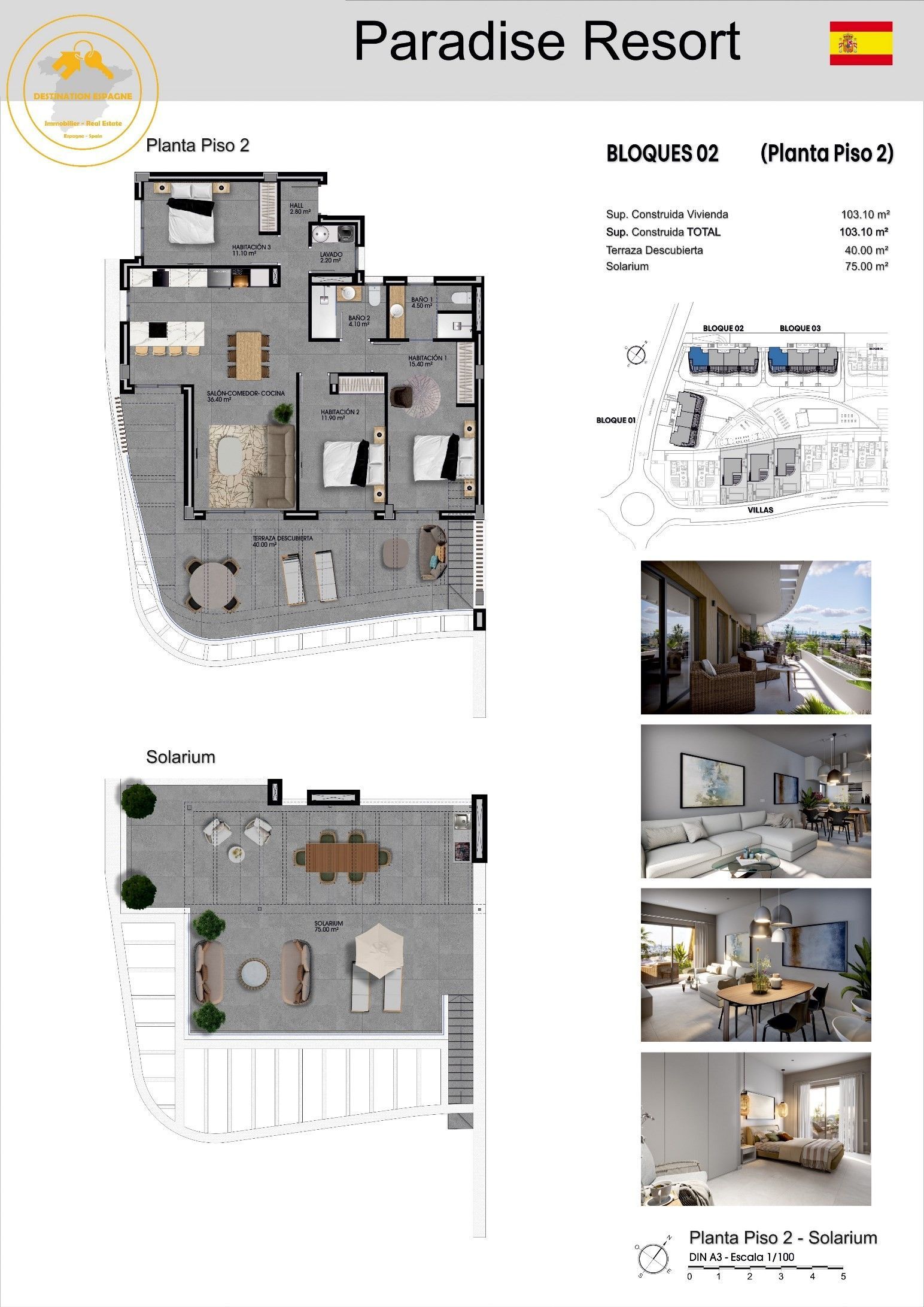 Caractéristiques : 3 chambres, 2 salles de bain, Cuisine ouverte, Salle à manger, Salon ouvert, Terrasse de 40 m², Solarium Privé de 75 m2 . …..