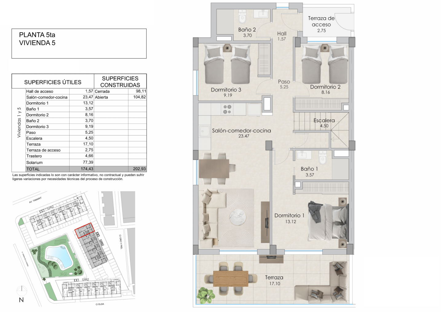 Caractéristiques: 3 chambres, 2 salles de bain, Cuisine, Salle à manger, Salon ouvert, Terrasses de 17,10 m2, Solarium de 77,39 m2….etc….