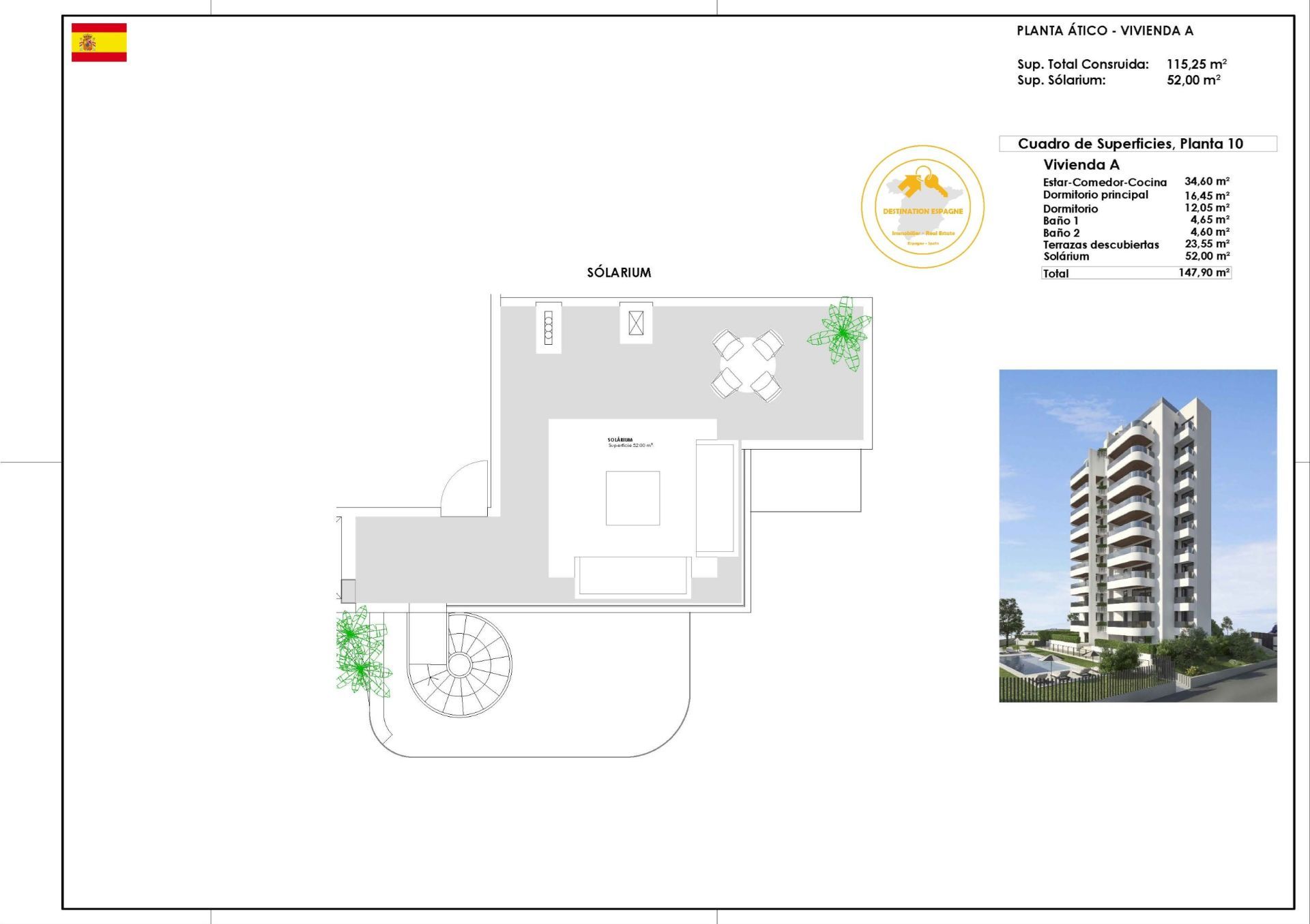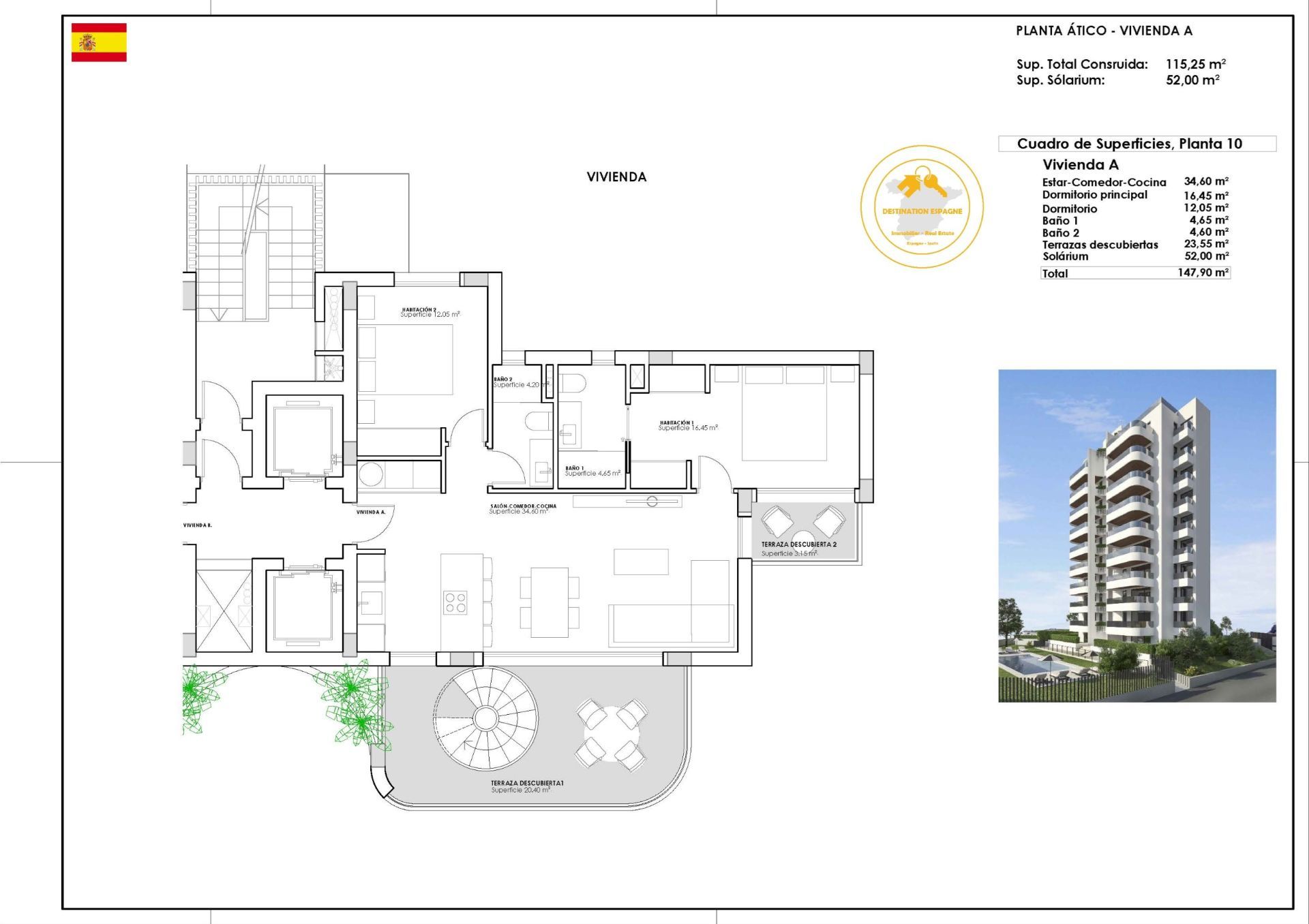 Caractéristiques : 2 chambres, 2 salles de bain, Cuisine ouverte, Salle à manger, Salon, Terrasses de 23,55 m2, Solarium Privé de 52 m2 …
